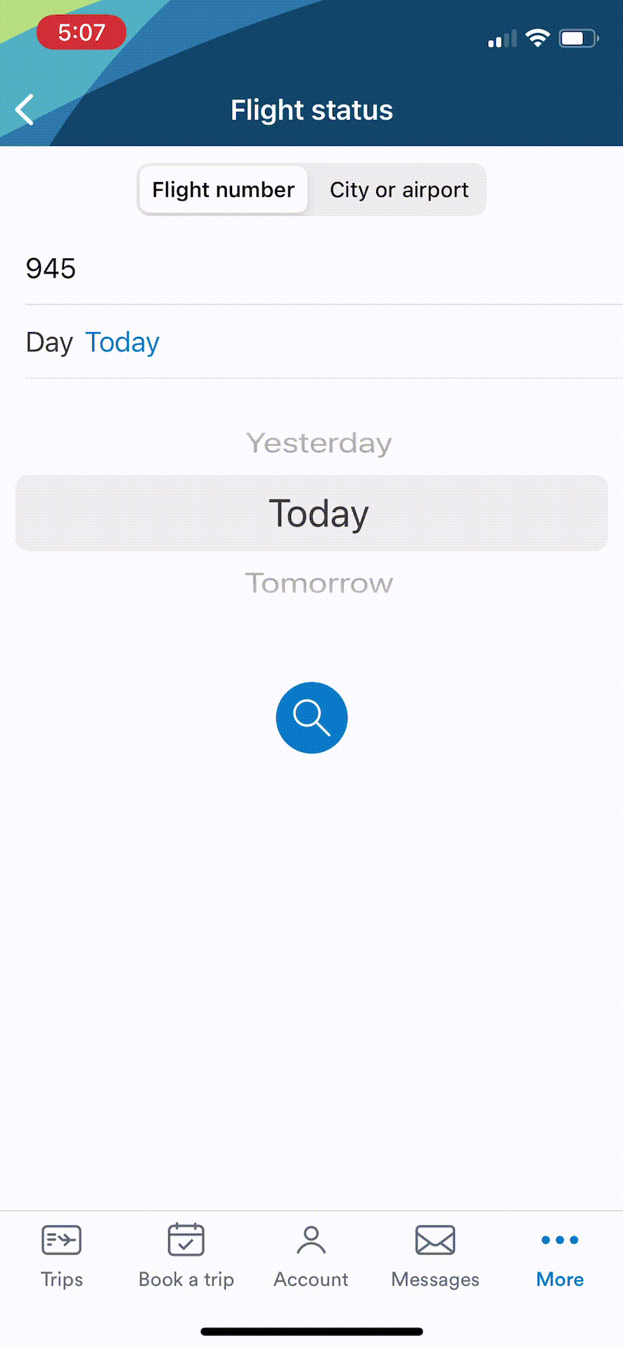 The Flight Status Feature is hidden within the More tab on the bottom right corner of the main screen