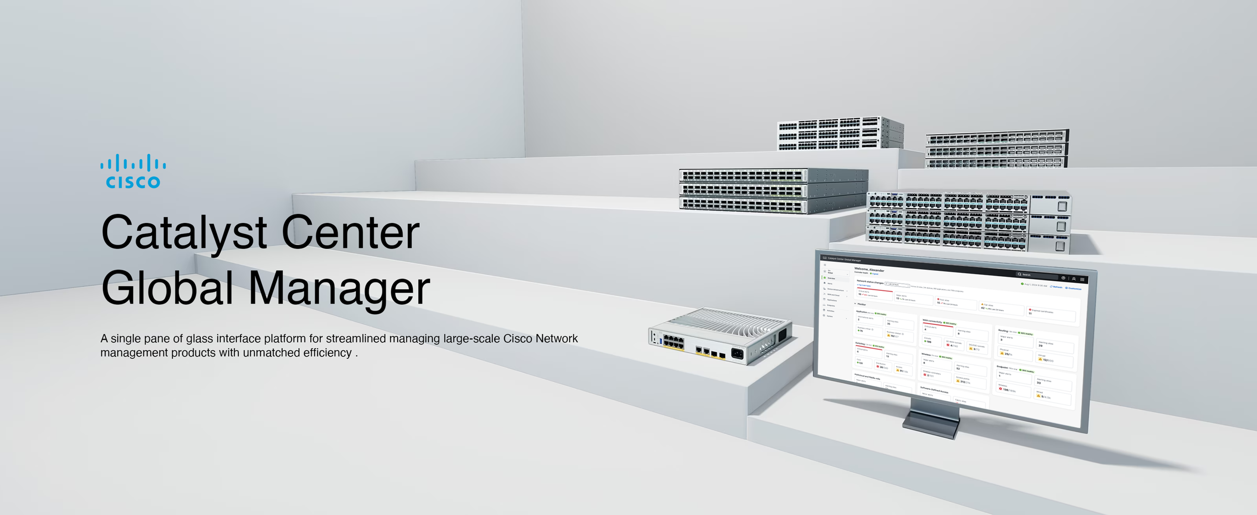 Catalyst Center Global Manager is a revolutionary platform for streamlined managing large-scale Cisco Network management product deployments. It offers users unparalleled control and visibility across expansive networks. simplifying management and scaling for distributed setups. By centralizing command and distributing control, it reduces operational costs while maximizing value.