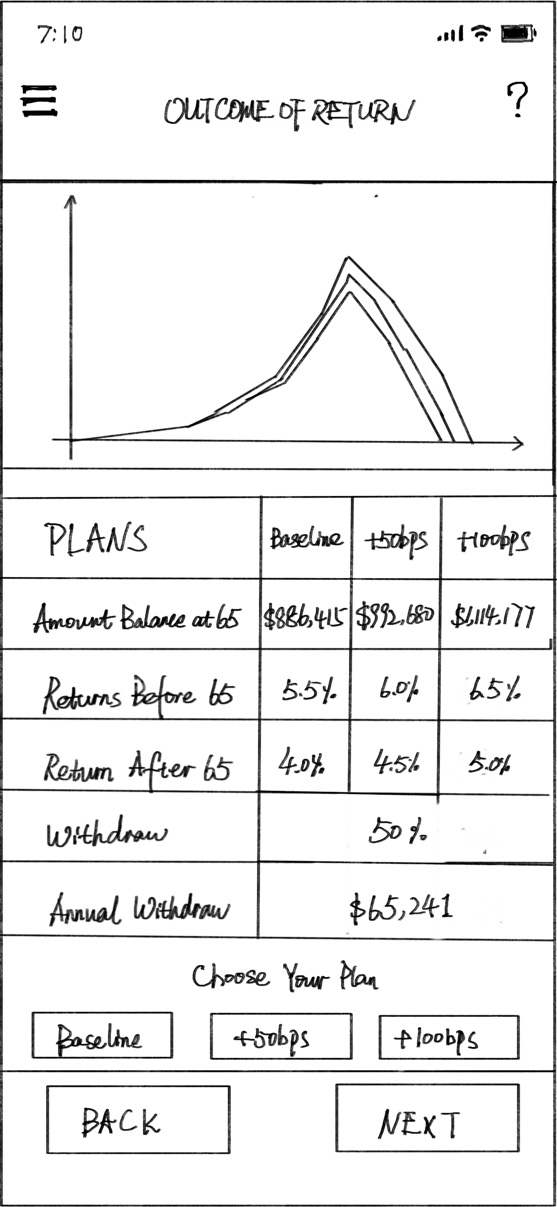 ABC Capital provides retire investment plans and seeks a design for a mobile app interaction that clients can use to visulize the dramatic outcomes that can result from slight changes in BPS (Basis Points). This is a sales, the critical information should be conveyed immediately and attractively, and the design should be easy to use.